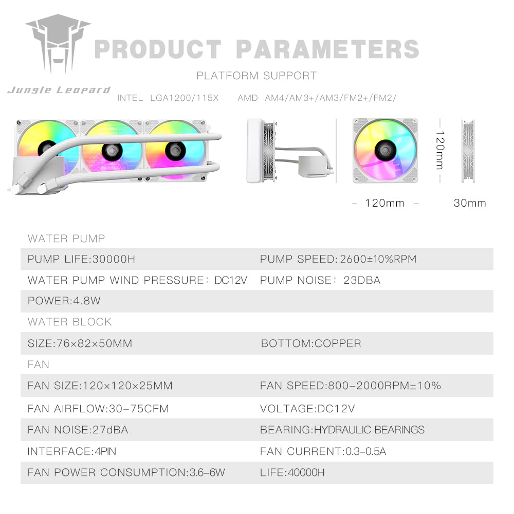 【Innovative Design】:Jungle Leopard TK1 360 aio ARGB liquid cpu cooler with infinite mirror design, new water pump and 2400RPM fan rotation provides three cooling factor of 280W to support the ARGB light synchronous fan set, high cooling performance, innovative technology to provide a large number of low-noise airflow, so that you can achieve the ultimate cooling performance of the CPU