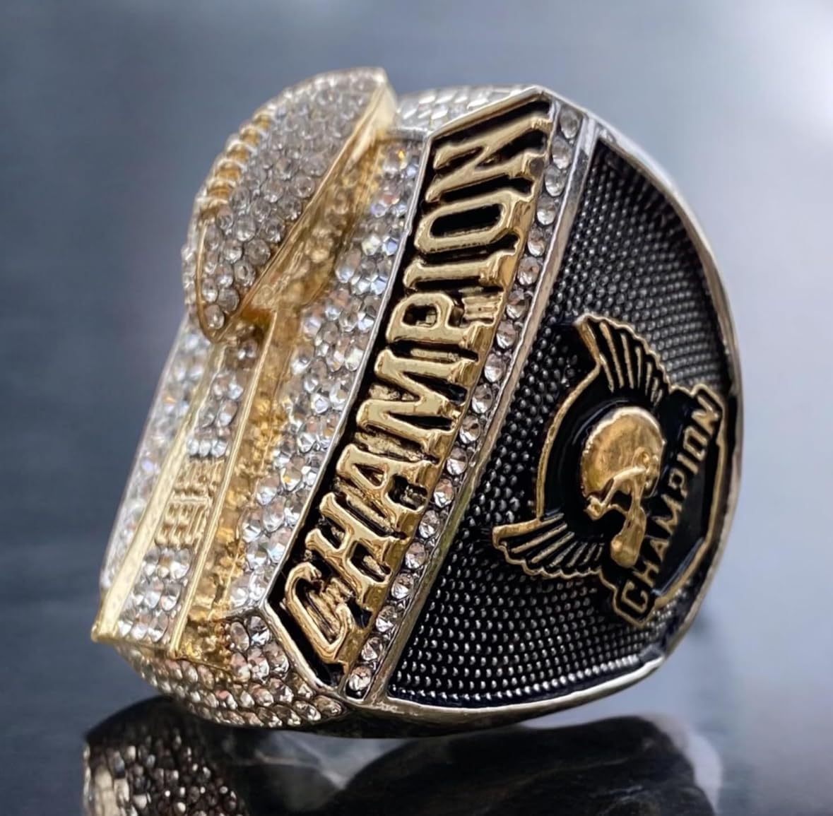 This is our latest 2025 design. It is a heavy and massive ring, sure to impress even the Fantasy Football opponents. Treat the winner of your Fantasy Football League with this gorgeous 2025 Fantasy Football Championship ring. It beats any fantasy football trophy on the market! Celebrate your 2025 Fantasy Football league victory with this detailed Fantasy Football Championship Ring, designed as a standout keepsake for winners, commissioners, and collectors. The ring features shiny clear stones, a football trophy centerpiece, and raised “2025” detailing for a bold and memorable look. It offers comfortable wear while still providing a solid, durable feel suitable for display or occasional use. The polished silver base with gold accents, engraved “FANTASY CHAMPION” text, and a side panel that reads “FANTASY FOOTBALL LEAGUE” create a striking appearance from every angle. Each ring includes a clear acrylic display stand, making it easy to showcase on desks, shelves, or inside a trophy case. This piece works well as a fantasy football award, end-of-season gift, team prize, or collectible display item. It also adds a fun finishing touch to league celebrations, draft events, or personal memorabilia collections, making it a versatile accessory for any fantasy football enthusiast.